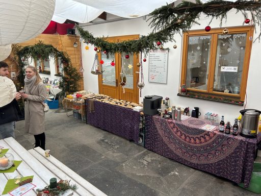 Der Raum hat eine Größe von ca. 45qm und ist durch große Fenster und Oberlichter hell, freundlich und lichtdurchflutet. Durch die Lage im Hinterhof ist es sehr ruhig. Der Innenhof ist überdacht und kann für Pausen bei jedem Wetter genutzt werden.